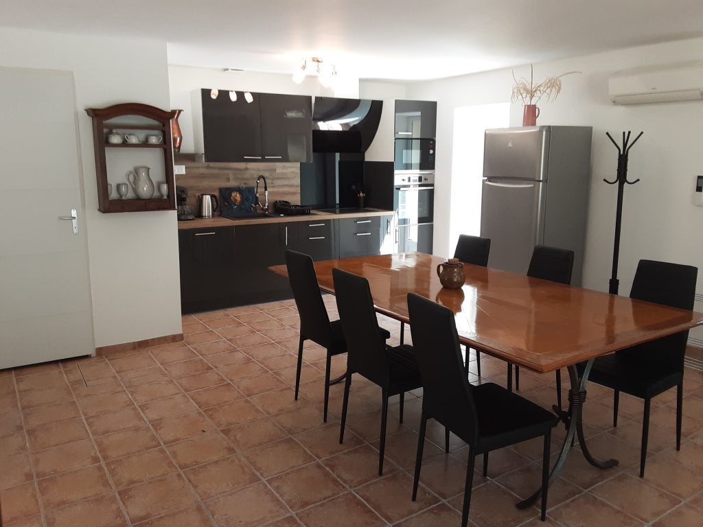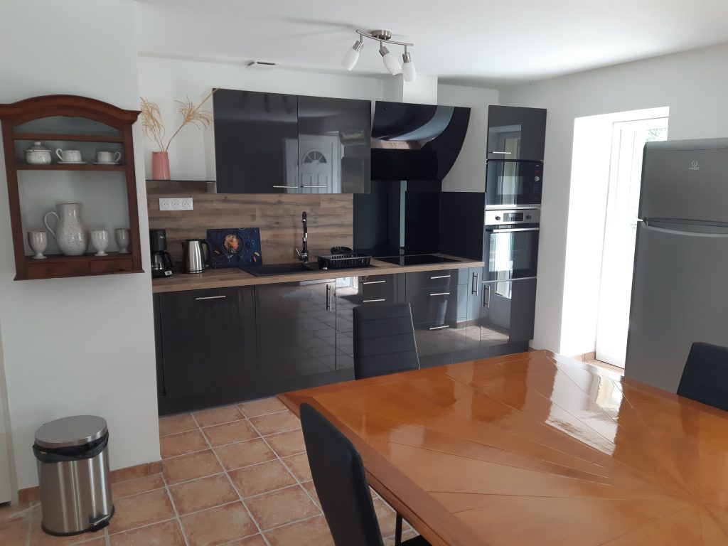 - d’une cuisine équipée avec lave vaisselle, plaque induction, four micro ondes, four traditionnel, cafetière Senséo, cafetière électrique, bouilloire électrique, grille pain, vaisselle et batterie de cuisine